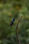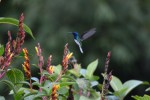 These brightly colored buzzbirds, White-necked Jacobin males to be specific, were spotted at the Asa Wright Nature Centre in Trinidad They spent most of their time in the air chasing each other away from the bushes and out of each others presumed territories, but when they did pause for a brief second, they received a lick of nectar in return for carrying some pollen to the next flower.