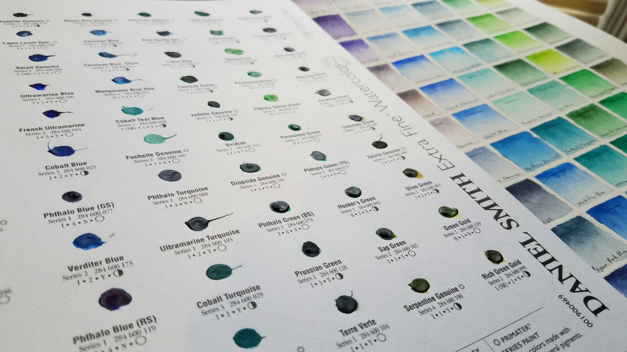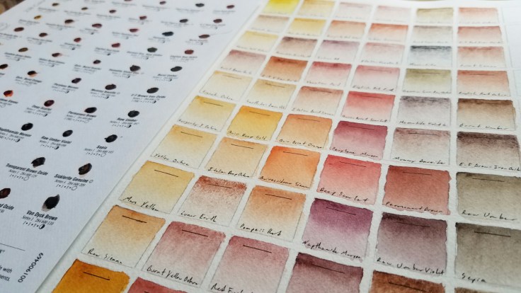 However, many other paints exist. One brand alone, Daniel Smith, makes more than 230 different kinds, dots of which they very nicely have put on sample pages for us curious nerds. Once in hand, you can see their whole catalog without spending thousands of dollars on tubes of paint you might not even want (or more likely, can’t justify buying).